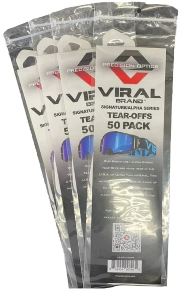 Viralブランドのティアオフは、シグネチャーシリーズとアルファシリーズのゴーグルにフィットし、完璧な視界を実現します。20個パック、50個パック、ラミネート加工の14個パックをご用意しています。今すぐご購入ください。